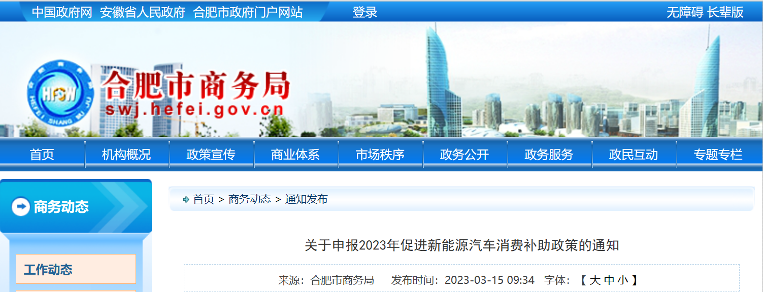 安徽省合肥市商務(wù)局關(guān)于申報2023年促進新能源汽車消費補助政策的通知為貫徹落實2023年《合肥市人民政府辦公室關(guān)于印發(fā)合肥市“提信心拼經(jīng)濟”若干政策措施的通知》...