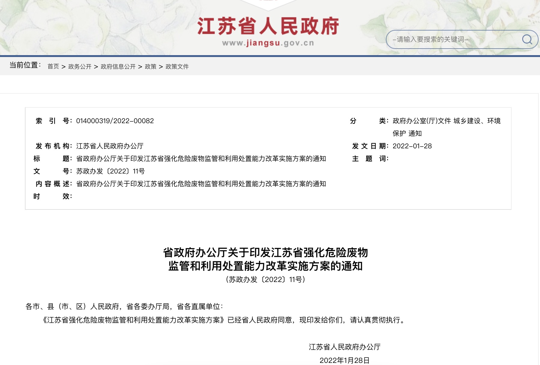 省政府辦公廳關(guān)于印發(fā)江蘇省強化危險廢物監(jiān)管和利用處置能力改革實施方案的通知(蘇政辦發(fā)〔2022〕11號)各市、縣(市、區(qū))人民政府,省各委辦廳局,省各直屬單位:...